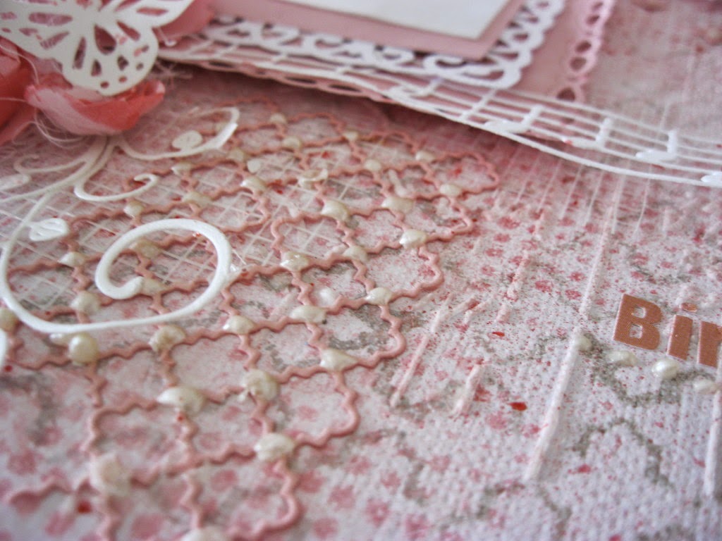 This is so gorgeous Libeeti! Super feminine. Because you have boys you don't get much chance of using these colours. Well, you rose to the challenge! It's beautifull. I love all the mixed media and of course the cute photo of you.